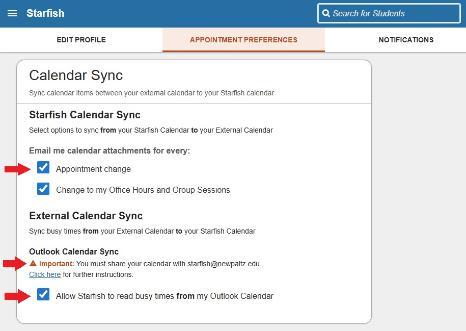 If you will be using the Appointment scheduling feature of Starfish, be sure to read through and complete the Calendar Sync section. You must fully complete the "Outlook Calendar Sync" section in order for Starfish to read your Outlook Calendar busy times. This will prevent you from getting double-booked if you have a meeting come up unexpectedly during a scheduled Office Hour block.