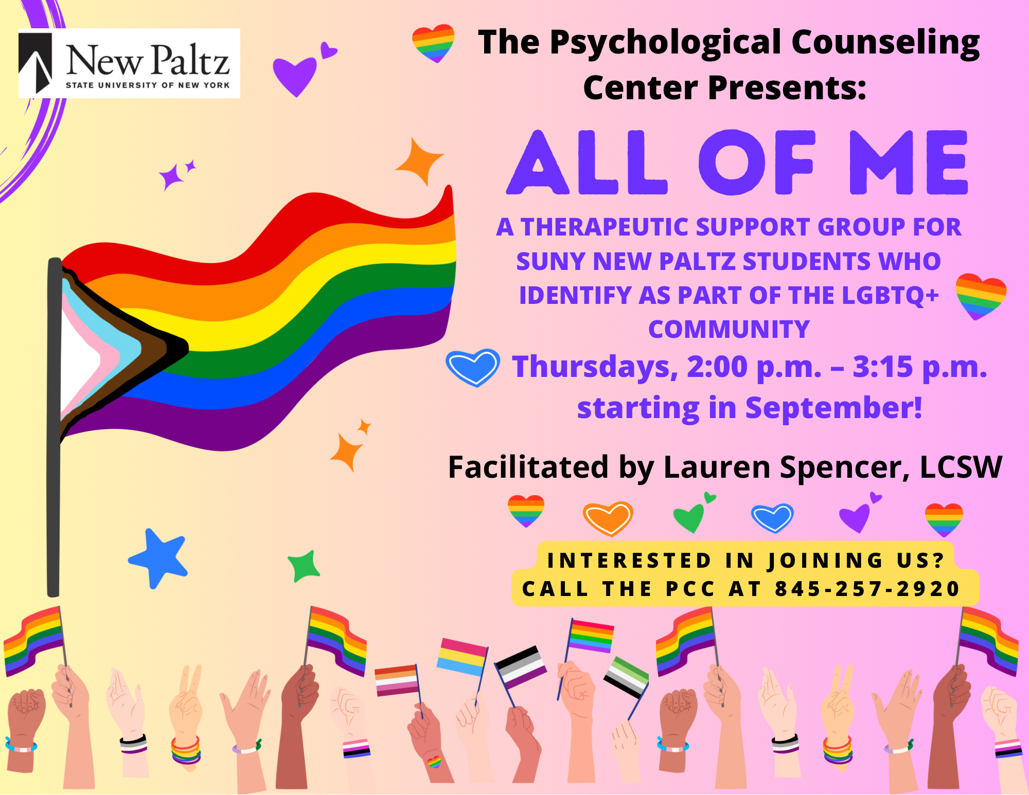 All of Me is a support group that invites you to show up as your full & fabulous LGBTQ+ self. In a world where expansive genders and sexualities are not always welcomed, let's create an affirming space and support each other in facing challenges, building resilience, learning skills to enhance safety, and celebrating our similarities & differences. Together we'll explore topics like intersectional identities, coming out, dealing with difficult relationships, and processing life & campus issues. And while we're at it - let's also make a practice of cultivating some hope & joy!