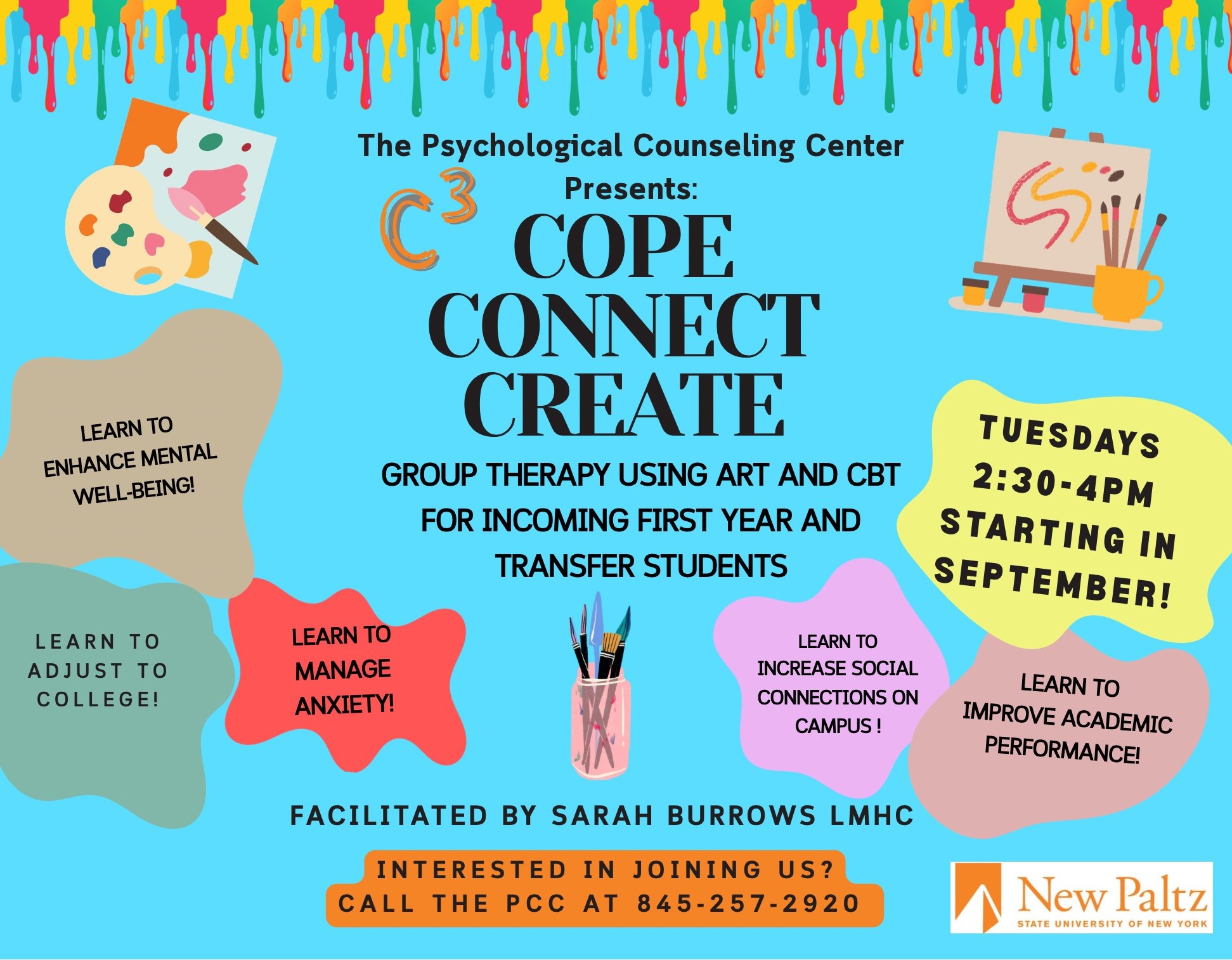 Come create with other students through this fun and interactive visual art-based group. We will focus on using the creative arts to foster connections and explore coping strategies to adjust to campus life. No prior art experience necessary, and if you have art experience that is great too. This group is open to all students, but First Year and Transfer students are particularly welcome as many topics deal with adjustment and transition.