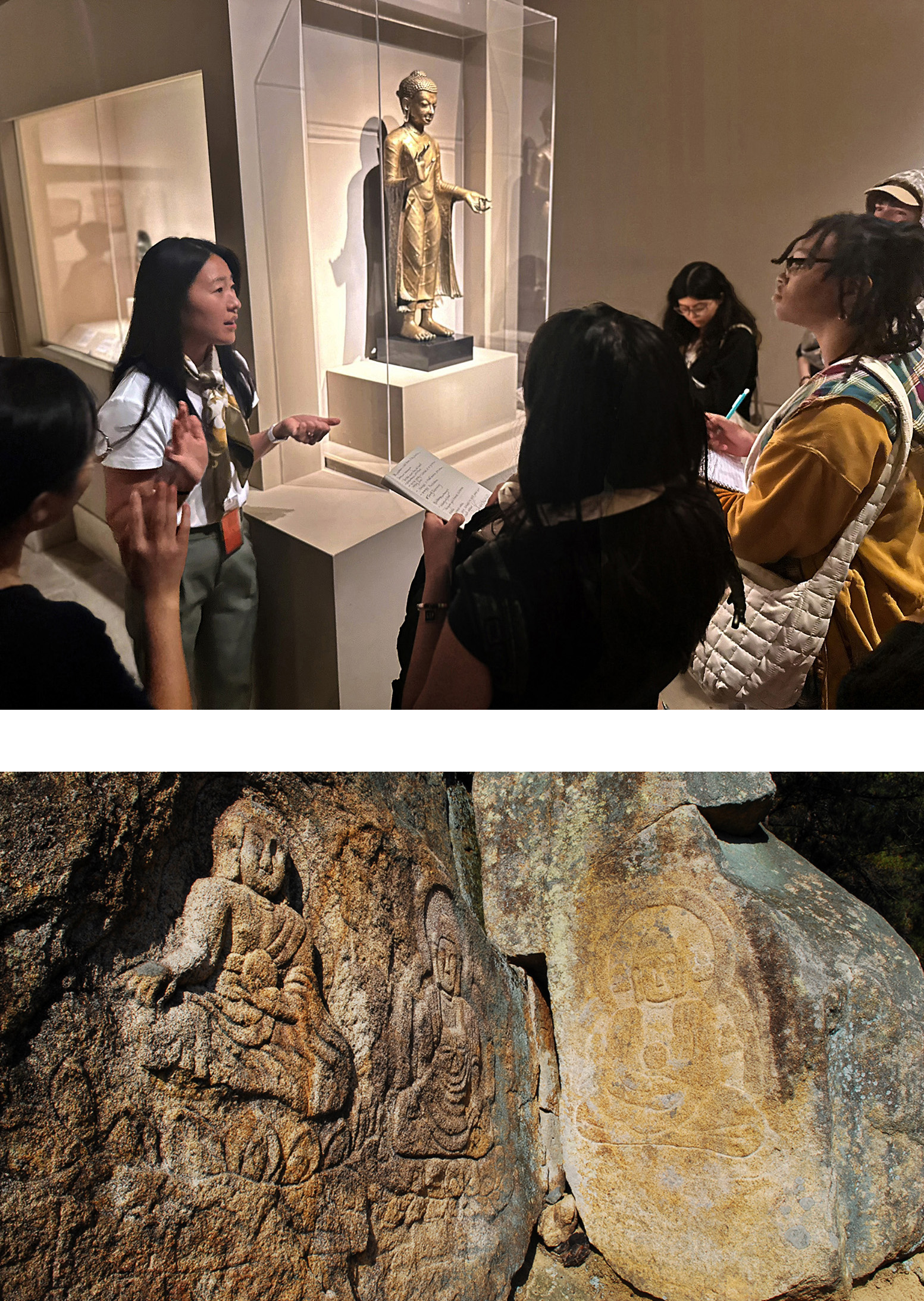 top: Dr. Lee with her students at The Met Museum; bottom: Three Seated Buddhas. 835 CE, Unified Silla (668-935). Rock carving; h. 96 cm. Yunŭl valley, Namsan, North Kyŏngsang province