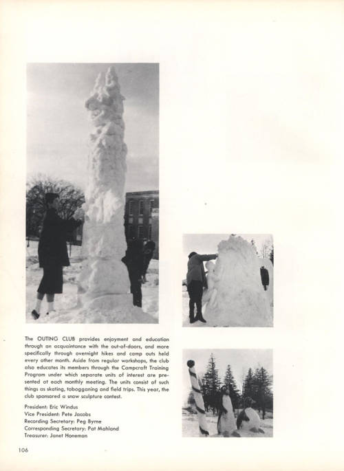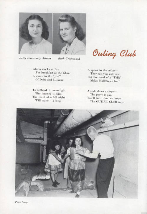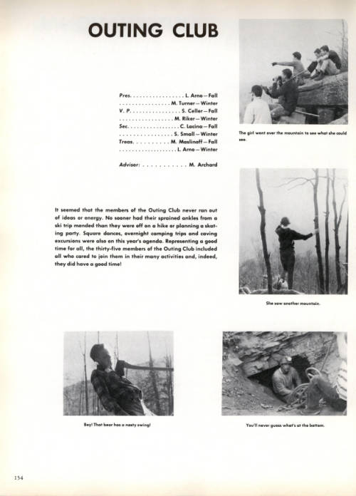 "The members of the Outing Club never ran out of ideas or energy. Representing a good time for all, the 35 members of the Outing Club included all who cared to join them in their many activities and, indeed, they did have a good time!” - 1964 Paltzonian