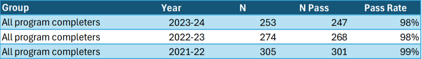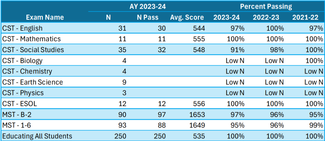 This table shows summary pass rates for the institution for the last three Title II reporting years (i.e., AY2021, AY2022, and AY2023). N is the number of unique students who took any exam, with N Pass representing the number of students who passed an exam, and the overall pass rate for the academic year.