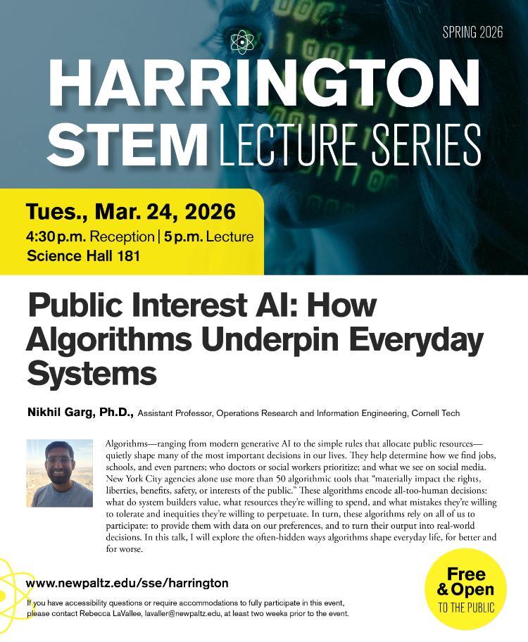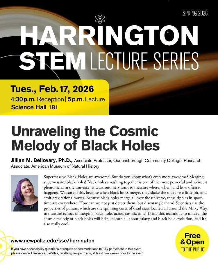 If you have questions or require accommodations to fully participate in the Harrington STEM Lecture Series, please contact Rebecca LaVallee at lavaller@newpaltz.edu as soon as possible prior to the event.